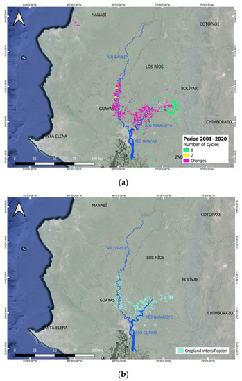 In this research, the spectral analysis of a 20-year MODIS NDVI time series has demonstrated a high capability to map cropland intensification in Ecuador during the period 2001–2020 by comparing the number of crop growth cycles per year between four subperiods. The criteria based on the maximum ordinate of NDVI periodogram at the periods 46, 23, and 15.3 enabled the identification of croplands with single-, double-, and triple-cropping, respectively.