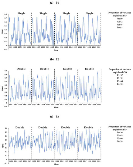 Examples of NDVI time series of cropland pixels with single-cropping (a) and double-cropping (b,c). Black lines separate 5-year subperiods. Proportions of the variance explained for the NDVI series in the periods 46 and 23 for single- and double-cropping, respectively, and for every 5-year subperiod to the right.