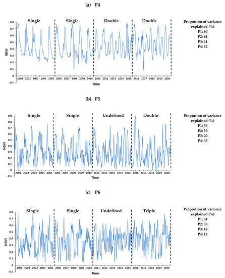 Examples of NDVI time series of cropland pixels with changes in the cropping system: from single- to double-cropping (a,b), from single- to triple-cropping (c). Black bars separate 5-year subperiods. Proportions of the variance for the NDVI series in the periods 46, 23, and 15.3 for single-, double-, and triple-cropping, respectively, and for every 5-year subperiod to the right.