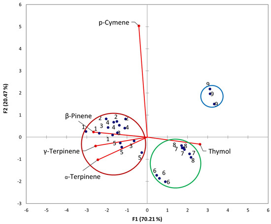 - The EO obtained by methods 6–9 (highlighted using blue and green circles) had a higher content of thymol and lower contents of β-pinene, α-terpinene, and γ-terpinene compared with the EO obtained by methods 1–5 (highlighted using red circle—discrimination on PC1);