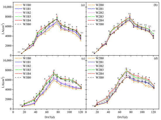 Leaf area (LA) as a function of DAT for the five biochar (B0, B1, B2, B3, and B4) application rates and three irrigation levels (W1, W2 and W3) for 2021 (a,b) and for 2022 (c,d). Note: “*” indicates that p < 0.05 was significant, while “ns” indicates that there was no significant difference.
