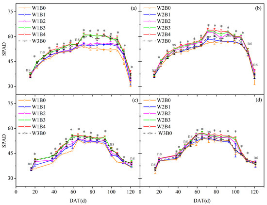 SPAD as a function of DAT for the five biochar (B0, B1, B2, B3, and B4) application rates and three irrigation levels (W1, W2 and W3) for 2021 (a,b) and for 2022 (c,d). Note: “*” indicates that p < 0.05 was significant, while “ns” indicates that there was no significant difference.