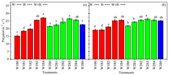 Net photosynthetic rates of leaves of tomato at fruit expansion stage for the five biochar (B0, B1, B2, B3, and B4) application rates and three irrigation levels (W1, W2 and W3) for 2021 (a) and for 2022 (b). Note: Different letters in the figure indicate that the mean values of each treatment are significantly different (p < 0.05). W, B and W × B represent irrigation level, biochar addition and their interaction on Pn, respectively. “***” indicate that significance was reached at p < 0.001.