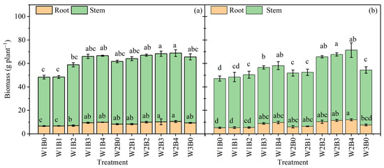 Root and stem biomass of tomato at the fruit expansion stage for the five biochar (B0, B1, B2, B3, and B4) application rates and three irrigation levels (W1, W2 and W3) for 2021 (a) and for 2022 (b). Note: Different letters in the figure indicate that the mean values of each treatment are significantly different (p < 0.05).