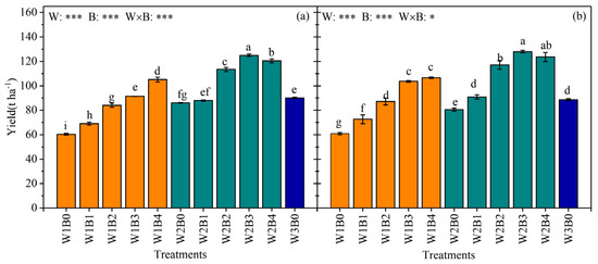 Greenhouse tomato yield for the five biochar (B0, B1, B2, B3, and B4) application rates and three irrigation levels (W1, W2 and W3) for 2021 (a) and for 2022 (b). Note: Different letters in the figure indicate that the mean values of each treatment are significantly different (p < 0.05). W, B and W × B represent irrigation level, biochar addition and their interaction on yield, respectively; “*” and “***” indicate that significance was reached at p < 0.05 and p < 0.001, respectively.
