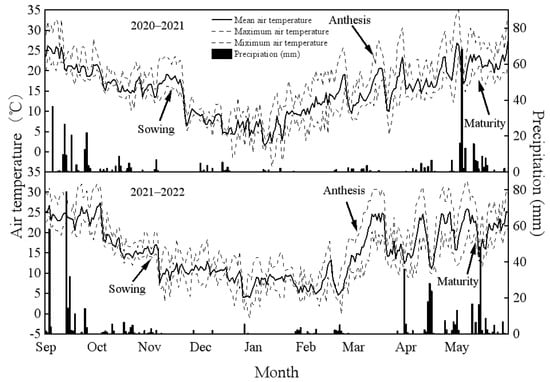 From 2020 to 2022, field experiments in Southwest China have been carried out at the Renshou experimental station (33°19′ N, 120°45′ E). The research station was established in the typical dryland farming system. According to official recommendations, the soil nutrition of wheat was found to be high in mineral K (138 mg kg−1), but poor in organic matter (15.8 g kg−1), alkali–hydrolyzable N (56.5 mg kg−1), and Olsen–P (6.4 mg kg−1) in the 0–20 cm layer. The mean air temperature and precipitation were 17.9 °C and 292.6 mm during wheat growth (Figure 1). As shown in Figure 1, the rainfall from sowing to anthesis was continuously low. In the experiment region, winter wheat–summer maize were the most typical rotation systems, and maize straw was utilized to cover fields where wheat is grown. Therefore, straw mulching was employed to alleviate soil drought and improve fertility [23,24,25].