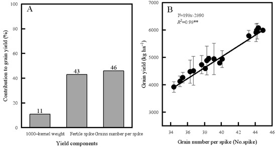 Analysis of the contribution of yield components to yield (A) and the relationship between grain number per spike and yield (B). n = 36. **, p < 0.01.