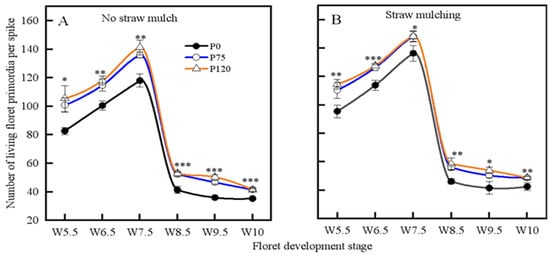 Effect of no straw mulch (A) and straw mulching (B) combined with phosphorus fertilizer on number of living floret primordia (NFS). Data in each treatment present all values for 2021–2022. n = 18. Vertical bars denote standard error (n = 3). Significance was only compared using P0 versus P75. *, p < 0.05; **, p < 0.01; *** p < 0.001.