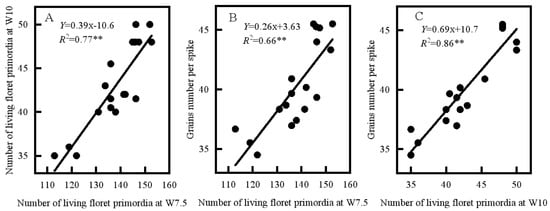 Number of living floret primordia at W7.5 correlated with W10 (A), number of living floret primordia at W7.5 (B) and W10 (C) correlated with grain number per spike. Data in each treatment present all values for 2021–2022. n = 18. **, p< 0.01.