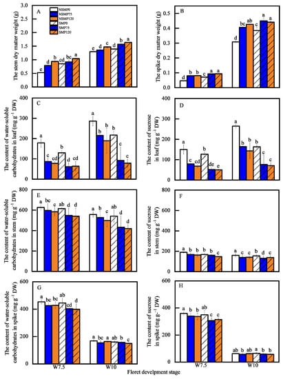 Effect of straw mulching combined with phosphorus fertilizer on the dry matter weight (A,B), water-soluble carbohydrates, and sucrose contents in leaf (C,D), stem (E,F), and spike (G,H) at W7.5 and W10. Different letters indicate significant differences (p < 0.05) among treatments according to LSD. Data in each treatment present all values for 2021–2022.