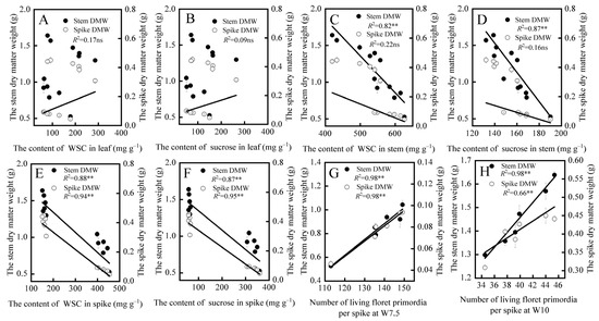 The dry matter weight of the spike and stem related to the WSC and sucrose content were further analyzed. The WSC and sucrose content of the leaf were not related to stem and spike DMW (Figure 6A,B). Moreover, there was a significant negative correlation between the WSC and sucrose content of the stem and stem DMW, and the spike showed the same trend. The WSC and sucrose content of the stem was not related to spike DMW, but the WSC and sucrose content of the spike were more related to stem DMW (Figure 6C–F), which also proved a competitive relationship between stem elongation and rapid spike growth. In addition, NFS was significantly positively correlated with spike and stem DMW (Figure 6G,H).