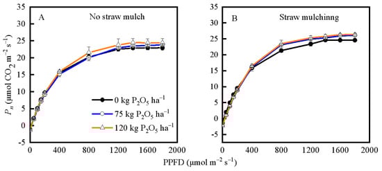 Effect of no straw mulch (A) and straw mulching (B) combined with phosphorus fertilizer on Pn in response to PPFD in the flag leaf at W10 in 2021. Data in each treatment present all values for 2021–2022. Each point represents the mean value of three replications ± standard error.