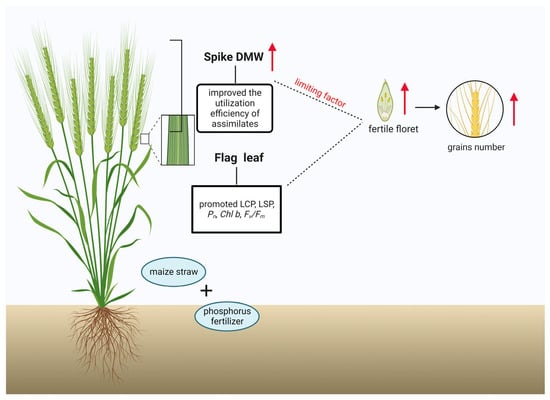 Cause and effect model illustrating how straw mulch and P fertilizer regulate utilization efficiency of assimilates and flag leaf photosynthesis in developing spike. Red arrows represent rising.