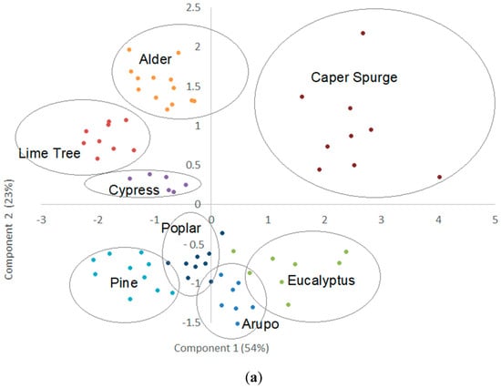 Due to the fact that the pine tree, poplar, eucalyptus, and arupo species are very close in the biphasic dispersion diagram (Figure 3a), we analyzed the possibility of better discriminating these species by carrying out another principal component analysis exclusively with six species (Figure 3b). The new values of the coefficients of each of the variables can be seen in Table 9. When only the samples of the pine tree, cypress, eucalyptus, arupo, alder, and lime tree species were used, the first principal component had the following equation: