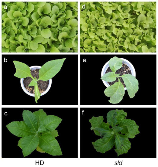 The spiral leaf and dwarf (sld) mutant is a stable leaf-spiraling and plant-dwarfing mutant resulting from self-crossed M5 generation of the cultivated variety of Nicotiana tabacum L., Honghuadajinyuan (HD), mutated by the chemical mutagen ethylmethane sulfonate (EMS), which comes from the Tobacco Mutant Library [71]. The sld mutant did not show the characteristic of leaves spiral mutation from germination to the euphylla cross of the seedling growth period (Figure 1d). Leaf tip distortion of the sld mutant seedlings gradually appeared during the development of seedlings. When the leaf number of the sld mutant grew to 3–5 leaves with one heart (Figure 1e), the leaves obviously showed a spiral growth model, with the growth point as the central axis. The sld mutant showed the typical phenotype of spiral, wrinkled leaves (Figure 1f), and the plant height was shorter from the rosette stage (Figure 2a,b). The reliable and stable spiral leaf and dwarf phenotype was observed for many years. The inheritance pattern of the sld mutant phenotype was manipulated by a recessive nuclear monogene (Table 1).
