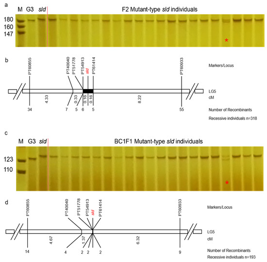 Based on the number of the recessive sld mutant-type recombinant individuals detected by the above six markers in the BC1F1 population, a genetic linkage group was constructed on linkage group 5. The upstream adjacent markers PT51778, PT54913, and the downstream adjoining marker PT61414 of the sld locus were all co-segregated with the sld locus, which was located within the larger region between the markers PT40040 and PT60933, with genetic distances of 1.37 cM and 6.32 cM, respectively. At the other end of the marker PT40040 was the marker PT60855 (Figure 3d). The relative positions of the six markers and the sld locus were in accordance with the linkage group constructed using the F2 population. This result verified that the six polymorphic SSR markers were genetically linked to the sld site.
