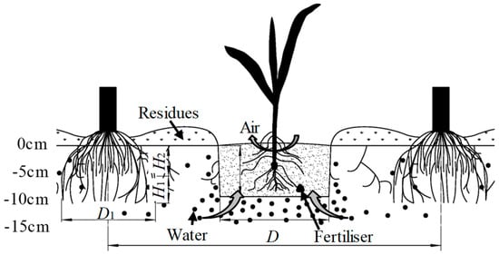 The design purpose of the strip-till machine was to build a high-quality seedbed with no straw residues and a consistent structure of the tillage layer prior to sowing. The structure of the constructed seedbeds is shown in Figure 1. Thus, the design requirements of the strip-till machine are as follows: (1) high-quality straw-cutting and strip-cleaning abilities, assuring clean ground after operation; (2) high soil-loosening and soil-crushing abilities, in order to create a suitable environment for planting operations and plant growth; (3) high ground profiling by the row units to ensure consistent tillage depth and promote seed germination.