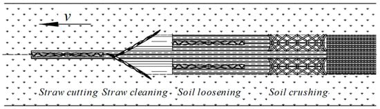 The automatic strip-till machine adopted a combined operating mode. Before working, the tillage-depth-stabilization control system regulated the air pressure inside air springs according to actual working conditions and agronomic requirements, and provided the unit with appropriate downforce, so it reached and maintained the target tillage depth. A pressure threshold was set for the automatic-width control system, which ensured the automatic row cleaner could operate stably at a suitable width. The space between the soil-loosening coulters and the rotating arm length was adjusted to the working width of the strip-till unit. During operation, this machine cleaned strips and tilled straw-covered land in the order of straw cutting > straw cleaning > soil loosening > soil crushing. The coulters cut off the residual straw between rows, and the automatic-width row cleaner pushed the residual straws into the working row and threw them to the two sides of the working width. The soil-loosening coulters loosened and broke the soil under the preset width in a clean row. Following that, the V-shaped soil-crushing device impacted and broke the loosened soil, forming clean and consistent strips. The working principle of the machine is shown in Figure 3.