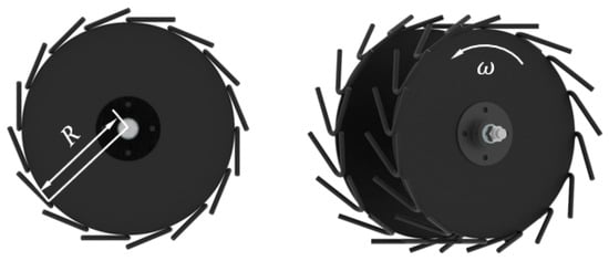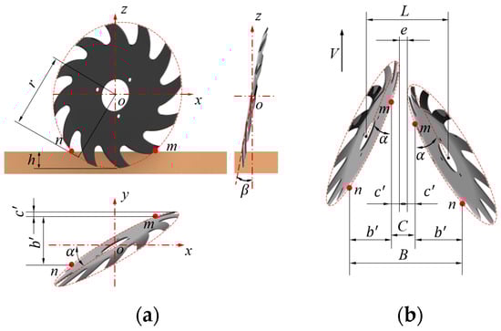 The star-tooth concave straw-cleaning wheels are the key part of the automatic row cleaner [29]. In order to increase the straw cleaning rate and avoid missing any areas, a staggered and opposite arrangement of the straw-cleaning wheels was adopted. The straw-cleaning wheels are shown in Figure 6. The main parameters are as follows: the radius (r) is 152.5 mm; the angle between the cleaning wheel and the advancing direction (α) is 30°; the angle between the cleaning wheel and the vertical plane (β) is 15°; and the distance between the two cleaning wheels (L) is 90 mm. When the working depth of the row cleaner is 20 mm, the straw cleaning width and the missed area are 225 mm and 0 mm, respectively, which meets the agronomic requirements.