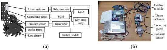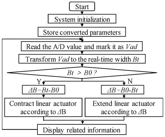 The system control flow is shown in Figure 8. When the system started to work, the internal resources were initialized first, including the system clock, I/O port, relevant registers, etc. The conversion parameter between the working width of the row cleaner and the output value from the S-shaped pressure sensor were stored in an array. Then, the SCM read the A/D switching value, Vad, outputted from the S-shaped pressure sensor, and converted Vad to the corresponding working width value which was Bt according to the conversion parameter as stored. The Bt at this moment was the real-time-detected working width. If Bt surpassed the preset working width threshold B0, the SCM estimated the corresponding difference ΔB (ΔB = Bt − B0) and thereby controlled the electric linear actuator to contract accordingly, so the row cleaner returned to the preset working width. On the contrary, if Bt was smaller than B0, the electric linear actuator elongated by the corresponding stroke, so the row cleaner returned to the preset working width. Relevant information (e.g., preset width B0, detected width Bt) was displayed on the LCD.
