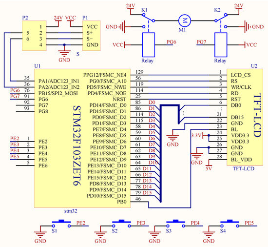 As seen in Equation (2), when the parameters of the row cleaner were determined, the working breadth B only correlated with the working depth h, and the automatic-width control system was developed based on this. The system regulated the working depth by monitoring the soil downforce of the straw-cleaning wheels in real time to ensure the stability of the working width. The schematic diagram of the main hardware in the system is illustrated in Figure 7. Specifically, the U1 was a microcontroller consisting of an STM32F103ZET6 Single-Chip Microcomputer (SCM); the P1 was an S-shaped pressure sensor, in which the signal output terminals S+ and S were, respectively, connected through a transduction amplifier to the ADC input pins, the PA1 and PA2 of the SCM. K1 and K2 were two peckers of the same type and function to control the stretching transformation of the electric linear actuator. The control ends of K1 and K2 were connected to the I/O pins PG6 and PG7 of the SCM, respectively, and their joint end was connected to two signal lines of the electric linear actuator, and the normal closed end was linked to the 24 V power supply. The normal open end was grounded. When the pin PG6 was at a high level and the pin PG7 outputted a low-level current, the electric linear actuator elongated; otherwise, the electric linear actuator contracted. When PG6 and PG7 were at the same level (either at a high or low level), the electric linear actuator did not move. Both S1 and S2 were the key modules, and U2 was the liquid crystal display (LCD) module, which realized the function of human–computer interaction.