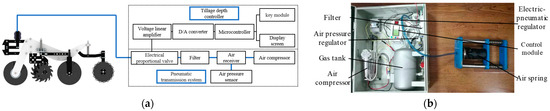 The tillage-depth-stabilization control system applies variable downforce to the parallel four-bar profiling mechanism of the row unit. In addition, it adjusts the internal pressure of the air spring through an electric proportional valve to achieve real-time and precise control of the downforce of the row unit on the ground, thereby improving the working depth stability. As shown in Figure 9, the system mainly consisted of a control module and a pneumatic transmission actuator. The control module consisted of a single chip microcomputer (SCM), a D/A converter, a voltage amplifier, a liquid crystal display (LCD), and a key-press array. The pressure transmission actuator consisted of an air compressor, a gas tank, an air pressure sensor, a filter, an electric-pneumatic regulator, and an air spring.