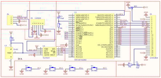 The control module was used to monitor pressure changes inside the air spring, and controlled tillage depth stability through real-time adjustment of gas flows by the electric-pneumatic regulator. The schematic diagram of the main hardware in the system is illustrated in Figure 10. This control module adopted a D/A converter (TLC5615 chips) to convert analog/digital signals, and used an STC12C5A60S2 Single-Chip Microcomputer as the microprocessor. The SMC ITV3050-312 electric-pneumatic regulator was inputted with 0–10 V analog/voltage signals. The ISOEM-U1-P2-O5 voltage amplifier can realize a double-gain function to the output signals from the SCM. The analog-to-digital converter ADC4 integrated in the SCM was used as the pins of the electric-pneumatic regulator to collect the internal pressures of the air spring. The port P0 was used as the data communication interface of the LCD module. The I/O pins P2.0–P2.1 simulated the IIC communication outlets, so as to ensure communication between the SCM and the D/A converter. The voltage regulator chip TL431 offered a basic reference voltage to the D/A converter, which ensured its working stability. The four buttons of the key-press array were connected via a low-level triggering mode to the I/O pins P3.4, P3.5, P3.6, and P3.7 of the SCM, respectively.