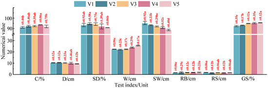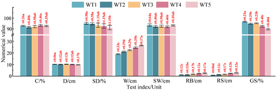 As shown in Figure 15, with the rise in theoretical tillage width, the width (W), furrow bottom roughness (RB), and surface roughness (RS) all increased, but the soil breakage rate (GS) declined. At the theoretical tillage width of 26 cm, the soil breakage rate of this machine declined to 89.8%, and the furrow bottom roughness and surface roughness rose to 2.6 and 2.8 cm, respectively. The reasons were that too large a tillage width gradually enlarged the distance between the two symmetrical coulters of the profiling soil-loosening device, so that the thrown and collision effects of the loose soil between the coulters were weakened. Moreover, too large a distance surpassed the soil disturbance width of single coulters, and so the soil breakage rate, furrow bottom roughness, and surface roughness all declined. This is similar to Hang’s finding that undisturbed soil increases through increasing the spacing between two V-shaped subsoiling tines [34]. Hence, the applicable theoretical tillage width for this machine was 18–24 cm.