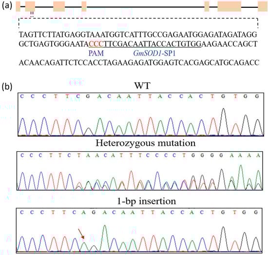 GmEOD1 gene structure and CRISPR/Cas9 target sequence (a) and homozygous targeted mutagenesis of GmEOD1 induced by CRISPR/Cas9 (b). The orange bands represent exons; the black lines represent introns; the underline represents the target sequence (named GmEOD1-SP1); the red letters are PAM sequences, i.e., archetypal interval sequences adjacent to motifs. The red arrow indicated the insertion of A nucleotide.