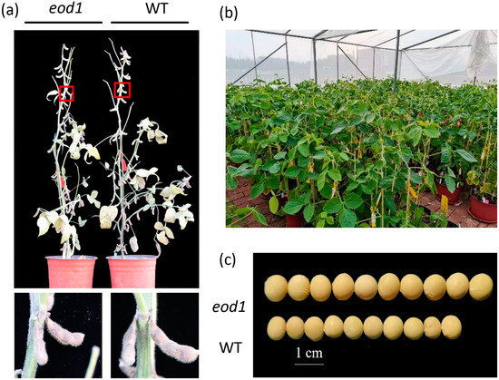 The overall plants, mature pods, seeds, and growth environment of the T2 generation mutant and WT plants were shown in Figure 3. The results showed that the seed size significantly increased, including the seed length (+4.6%, p < 0.05), seed width (+8.0%, p < 0.001), and seed thickness (+7.2%, p < 0.001) in T2 homozygous eod1 mutant plants (Figure 3), and the eod1 mutant plants had significantly higher 100-seed weight (+15.7%, p < 0.001) compared to the WT. The number of seed per plant exhibited no significant difference. Though the average of the seed weight per plant in eod1 mutant was higher than WT, there is no significant difference between them. These results exhibited that the T2 homozygous eod1 mutant plants showed a higher seed size phenotype. However, the mutant plants did not differ significantly from the WT in traits of plant height, number of effective branches, number of main stem nodes, and number of pods per plant.