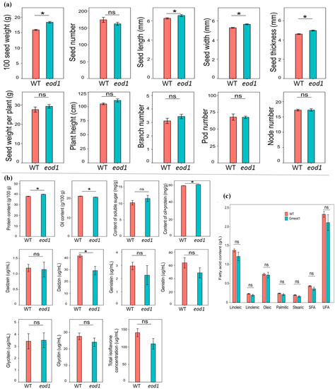 Analysis of seed size related agronomic traits (a) and physiological traits including protein, oil, soluble sugar and isoflavone contents (b) and five major fatty acid contents (c) between eod1 mutant and WT. The asterisk (*) indicates statistical significance, p < 0.05; ‘ns’ indicates no significant difference, p > 0.05.