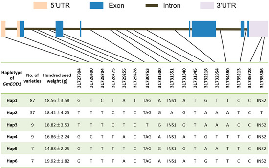 Sequence analysis of the EOD1 genome of 156 cultivars showed that there were variants in the exon, intron, and UTR regions, and six haplotypes were categorized (Figure 4). A total of 17 SNPs, including 1 allele in the 5′UTR (Gm13: 31727840...31728348), 14 alleles in genomic region (Gm13: 31728349...31735342), and 2 alleles in the 3′UTR (Gm13:31735343…31735910), were identified. The hap1 was the major haplotype with relatively higher average 100-seed weight of 18.56 ± 3.58 g, and represented more than half cultivars (87 cultivars) of the total. The hap2 covered 37 cultivars and the average 100-seed weight was 18.42 ± 4.25 g, slightly higher than that of hap1 (p > 0.05); the rare hap5 with average 100-seed weight of 14.88 ± 2.25 g, 19.8% lower than that of hap1 (p < 0.05). The average 100-seed weight varied among the haplotypes, implying that EOD1 gene sequence variation may be associated with seed weight.