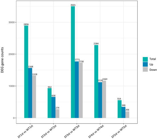 Among the five sampling stages, which were taken every 10 days since R5 (when seeds in pods reach up to 3 mm in length at any of the four uppermost nodes of the main stem with fully grown leaves), transcriptome profiling identified a total of 3501 differentially expressed genes (DEGs) in the third stage, with 1730 up-regulated and 1771 down-regulated genes, showing the highest number of DEGs (Figure 5). In contrast, the fifth stage had the lowest number of DEGs, with only 554 genes differentially expressed, of which 206 were up-regulated and 348 were down-regulated. Transcriptome analysis of the target gene at each of the five stages revealed that GmEOD1 was consistently downregulated from the first to the fifth stage (log2Fold Change < 0) (Table S7), indicating that knockdown of the GmEOD1 gene in the eod1 mutant resulted in decreased expression of this gene.