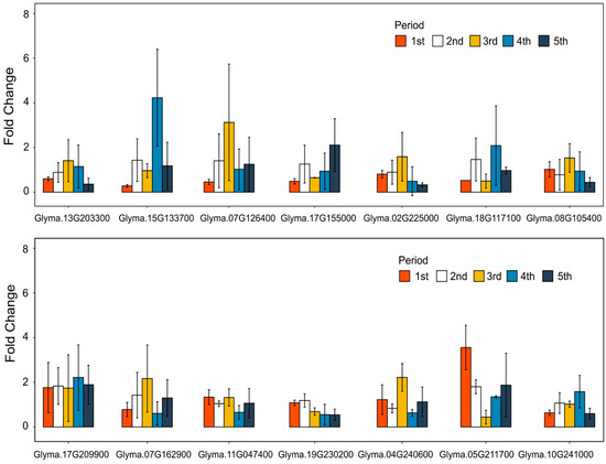 qRT-PCR validation of candidate genes in stages 1–5. The x-axis represents the name of 14 candidate genes, y-axis shows the fold change (FC) value increase/decrease in expression level of the genes.