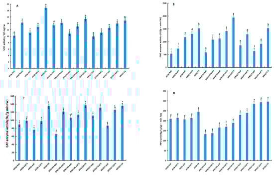 The POD activity was measured as the H2O2-dependent oxidation of ascorbic acid. The reaction mixture contained 25 mM potassium phosphate buffer (pH 7), 0.1 mM EDTA, 1 mM H2O2, 0.25 mM ascorbate, and 50 μL enzyme extract. The enzyme activity was determined using an extinction coefficient of 2800 M/cm. The activity was measured as the decrease in absorbance at 290 nm for 1 min. One unit of POD activity was defined as the amount of enzyme needed for the oxidation of 1 μmol of ascorbate per minute, and the specific activity was expressed as units per milligram of protein [44].