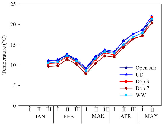 Figure 1 shows the average daily temperatures recorded inside the different greenhouse prototypes and in the open air. In all the treatments, the temperature reached the minimum value in the first week of March and the maximum in mid-May. Specifically, the outdoor temperature ranged between 9.0 °C to 21.1 °C, respectively. The undoped PMMA determined a general increase in temperature (+2 °C on the average of the 12 weeks), while doping treatments with rare earths and whitewashing decreased the thermal level compared to outside (−0.6, −1.2, and −0.4 °C, for Dop3, Dop7, and WW, respectively).