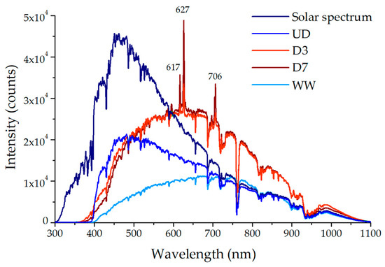 The optical properties of undoped and doped PMMA panels were investigated through two different UV-Vis spectrophotometers used for spectral measurements both in laboratory and in the field. Figure 2 shows the incident solar radiation (solar spectrum) and the transmission spectra recorded under undoped (UD), doped with 3% (D3) and 7% (D7) of rare earths and whitewashed (WW) PMMA panels. The UD PMMA control panel totally absorbed the incident UV radiation without emitting supplementary wavelengths. Conversely, under the doped panels, the absorbed UV radiation was converted into the emission of three different peaks in the red region because of the photoluminescent effect. The panel with the highest doping proportion (D7) exhibits more pronounced photoluminescence peaks.