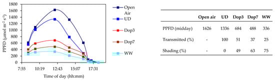 The light spectra inside and outside the greenhouses were measured with an Optics Maya 2000 Pro spectrophotometer (Ocean Insight, Oxford, UK; spectral range 165–1100 nm), set at a 14 ms integration time. The total irradiance in the spectral range 400–1050 nm was measured using an HD2102.2 photoradiometer (Delta Ohm, Padua, Italy), equipped with a LP471RAD (Delta Ohm) radiometric probe with a cosine corrector. Light intensity, or photosynthetic photon flux density (PPFD) in the 400 to 700 nm PAR (photosynthetically active radiation) range, was measured in µmol photons m−2 s−1 with the PAR sensor of a PSI PAR-FluorPen FP 110/D (Photon Systems Instruments, Drásov, Czech Republic) on the same day of the chlorophyll fluorescence measurements.
