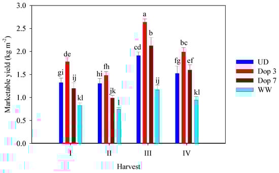 Marketable yield (in kg m−2) of greenhouse wild rocket as affected by the interaction between cover panels and harvest time (I: 17 March; II: 6 April; III: 26 April; IV: 19 May). Values are means ± standard error. Different letters indicate significant differences according to Tukey’s HSD test at p ≤ 0.05.