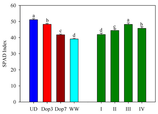 SPAD index (leaf chlorophyll content) in wild rocket as affected by greenhouse cover and harvest time. Values are means ± standard error, different letters indicate statistically significant differences according to Tukey’s HSD test at p ≤ 0.05.