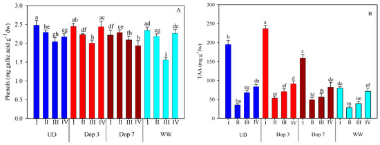 Total phenols (A) and total ascorbic acid (TAA) (B) in leaves of wild rocket as affected by the interaction between greenhouse cover and harvest time. Values are means ± standard error, different letters indicate statistically significant differences according to Tukey’s HSD test at p ≤ 0.05.