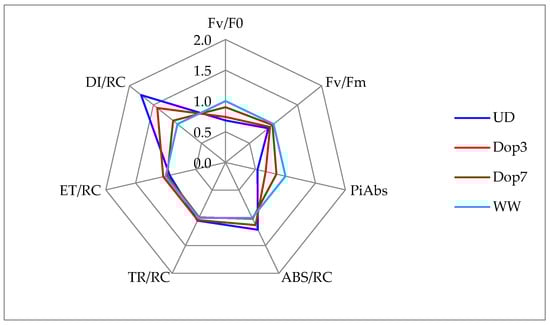 The calculated values of a selected subset of JIP-test parameters are reported in Table 5, while the relative variations of each parameter (normalized to the respective value measured under the WW greenhouse) are shown in the radar plot in Figure 8. The highest Fv/Fm and Fv/F0 ratios were recorded under the WW greenhouse, and progressively lower values under the Dop7 (not significantly different), Dop3 and UD greenhouses. The same trend was observed for the Performance Index (PiAbs), which was 87% higher in WW compared to UD plants (Table 5 and Figure 8).