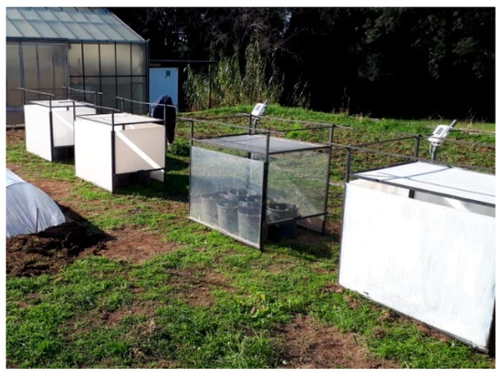 Pots were placed in small prototype greenhouses (length 100 cm, width 70 cm, height 70 cm), under four PMMA-based panels (described in Section 2.2):
