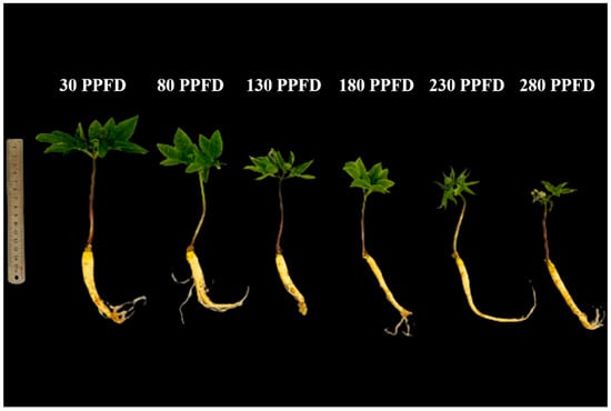 More importantly, the whole weight, root weight, shoot length, and stem length and diameter progressively decreased as the light intensity increased, revealing that 30 PPFD for the treatment of PGSs may be the most effective method for promoting the shoot and root growth. This is consistent with Kuronuma’s findings suggesting that ginseng plants could be dormant when high light intensity is applied after early growth cultivation [8]. Jang showed that the 25 PPFD-spiked ginseng seedlings possessed the longest shoots, which is parallel with the findings in the present study [17]. Interestingly, regarding the dry root weight between 30 PPFD and 80 PPFD, no statistical differences were conferred (Figure 3B), which may probably be ascribed to the finding that high light intensity is required during the ginseng early growth stage in order to break the dormancy [8,35].