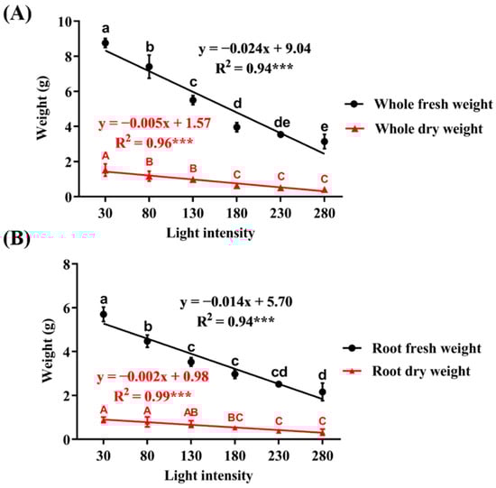 However, significant (34.5%) decreases concerning the root dry weight were detected when the light intensities increased from 80 to 180 PPFD (Figure 3B). In addition, the light intensity-conferred impacts on the investigated fresh weight and dry weight were significant according to the F-test results (***, p ≤ 0.001).