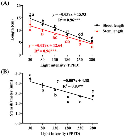 Effects of light intensity on ginseng (A) shoot length and stem length and (B) stem diameter. Values are means ± SDs of n = 5 biological replicates. Significant differences for identical parameters among different light intensities are denoted by different letters, following Duncan’s multiple range test at p = 0.05 (one-way ANOVA). The significant interactions between the light intensity and the investigated parameters were determined via F-test and are indicated by different numbers of asterisks (**, p < 0.01; and ***, p < 0.001).