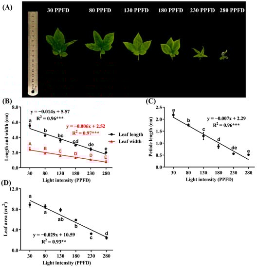The effects of light intensity on ginseng (A) leaf morphology and status, (B) leaf length and width, (C) petiole length, and (D) leaf area. The presented data are expressed as means ± SDs (n = 5 replicates). Different letters indicate significant differences according to Duncan’s multiple range test at p = 0.05 (one-way ANOVA). The significant interactions between the light intensity and the investigated leaf parameters were determined via F-test and are denoted by different numbers of asterisks (**, p < 0.01; and ***, p < 0.001).