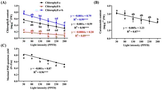 The effects of light intensity on ginseng (A) chlorophyll contents, (B) carotenoids contents, and (C) the maximal quantum yield of photosystem II (Fv/Fm). The displayed values are expressed as means ± SDs (n = 5 independent replicates). Different lowercase letters indicate significant differences according to Duncan’s multiple range test at p = 0.05 (one-way ANOVA). The significant interactions between the light intensity and the investigated photosynthetic characteristics were determined via F-test and are denoted by different numbers of asterisks (**, p < 0.01; and ***, p < 0.001).