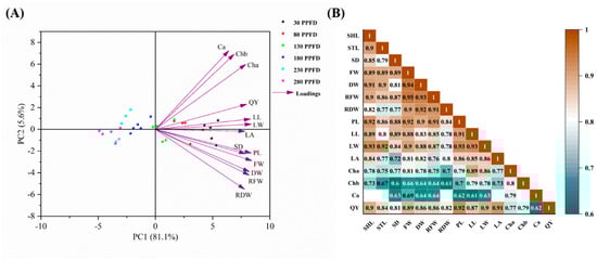Multivariate data analysis using (A) PCA and (B) a heatmap of Pearson’s correlation matrix among the investigated growth and photosynthetic characteristics. Cyan color and brown color indicate low R values and high R values, respectively. Abbreviations: SHL: shoot length; STL: stem length; SD: shoot diameter; FW: whole fresh weight; DW: whole dry weight; RFW: root fresh weight; RDW: root dry weight; PL: petiole length; LL: leaf length; LW: leaf width; LA: leaf area; Cha: chlorophyll a; Chb: chlorophyll b; Ca: carotenoids; QY: the maximal PSII quantum yield (Fv/Fm).