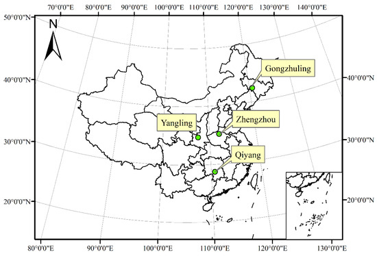 Locations of the long-term field experiments of Qiyang, Yangling, Zhengzhou, and Gongzhuling across China upland.